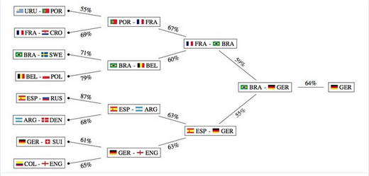 De acordo com o modelo em questão, a Espanha parte como a favorita para ganhar a Copa com a probabilidade de 17,8 %. A Seleção Espanhola é seguida pela Alemanha (17,1 %) e Brasil (12,3 %).